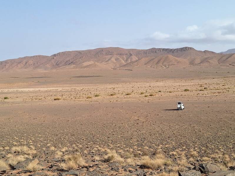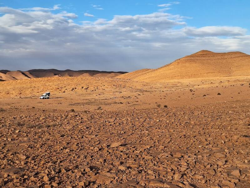 Nous allons bivouaquer sur le plateau derrière TISSINT, au petit village de Akka N'Ait Sidi, avec une vue magnifique et une nuit passée avec les chèvres du village venues nous rendre visite.