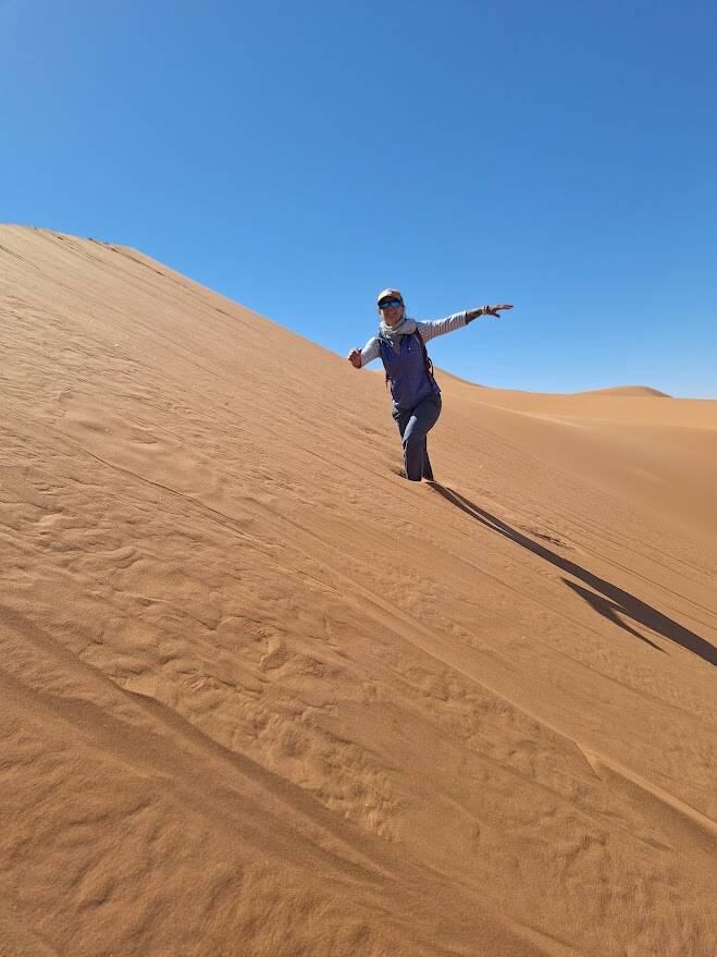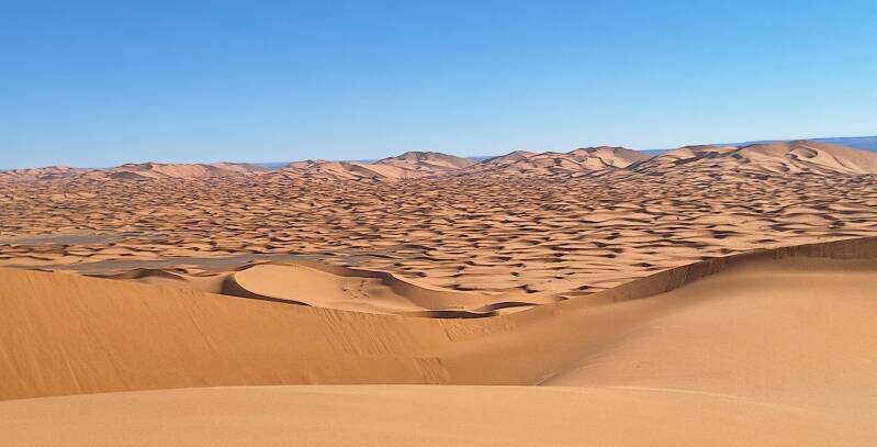 Pour vraiment apprécier l'Erg Chebbi, c'est à pied qu'il faut partir (avec beaucoup d'eau et un chapeau) au travers des dunes, et ne pas se contenter de ce que tout le monde appelle "la grande dune" haute de 160 m (attention, réveillez vous tôt et allez y voir le levé du soleil, cela vous évitera la foule de l'après midi et du soir qui envahissent littéralement les lieux !), non, il faut rentrer à l'intérieur, là ou vous n'entendrez plus ni les motos, ni les voitures, et pire, les quads qui ravitaillent les différents camps installés en bordure de l'Erg et qui dénaturent complétement les lieux, surtout lorsqu'ils laissent bouteilles en plastique, emballages, divers, canettes et j'en passe... c'est un vrai problème que de nombreux propriétaires de camping alentours (entre autre celui de la "Gazelle Bleue" qui du coup est mal vu de la plupart des agences au regard de ses nombreuses plaintes auprès des administrations ) essayent de prendre en main, mais le gouverneur local (équivalent de notre maire) semble n'en n'avoir que faire et à bien peu de volonté de changer quoi que ce soit, seul le développement à outrance semble avoir d'importance à ses yeux....