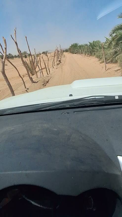 Une fois prêts, les pleins faits nous devons continuer la route et c'est encore une fois par ces palmeraies désastreusement sèches que nous mettons le cap toujours plus au sud; Combien de jardins sont abandonnés, combien de palmiers sont perdus à tout Jamais ?