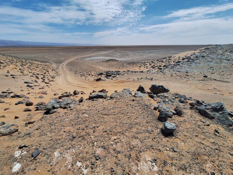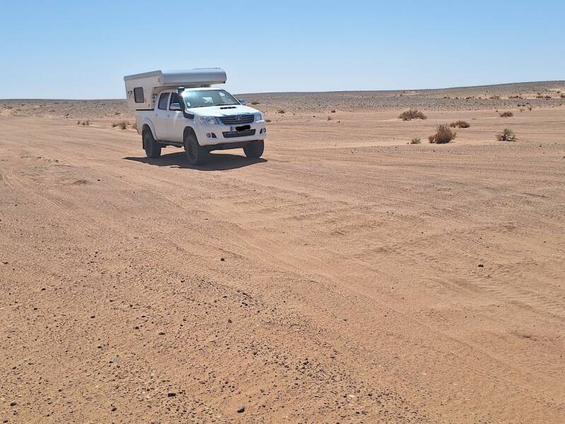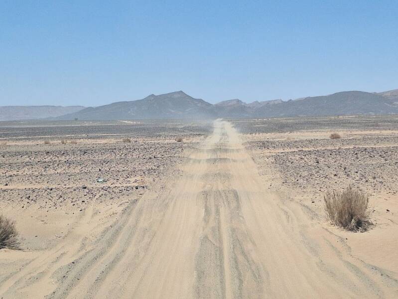 Heureusement le propriétaire du camping de la "Gazelle bleue" m'avait prévenu et nous sommes passés sans encombres; désormais une grande piste anodine s'offre désormais à nous, mais attention, les pièges y sont nombreux entre le fesh-fesh, les passages de caillasses vraiment cassants, les trous ou la tôle ondulée, et le vent de sable qui rends parfois la visibilité nulle, mieux vaut ne pas faire les malins !