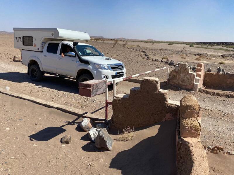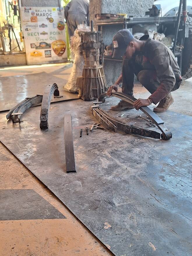 Et la team en plein boulot pour me rajouter une lame arrière de... Mercedes 207 (et oui, moi le Toyotiste absolu depuis quasi 40 ans, je laisse s'infiltrer une intrue sur mon véhicule, pour dire à quel point j'ai confiance en Ali !) afin de ne pas trop forcer sur le chassis et d'être encore plus stable sur les pistes; Ce "petit" travail - mais o combien indispensable à la vue des nombreux chassis cassés en raison du poids des cellules - qui n'aura durer que 2h00 va en effet être d'une grande aide dans le reste de notre périple, encore une fois, merci à toi Ali Nassir !