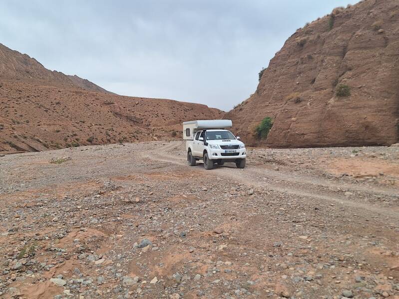 On file dans l'oued d'AGUERD auquel on accède juste avant le village - les locaux nous expliquent qu'il y a eu des pluies qui ont abimées la piste qui surplombe l'oued et que désormais il faut passer dedans mais que peu de personnes empruntent l'itinéraire car un peu "secouratif" que je traduit par "qui secoue un peu" , nous allons bien voir, cela semble trop beau !