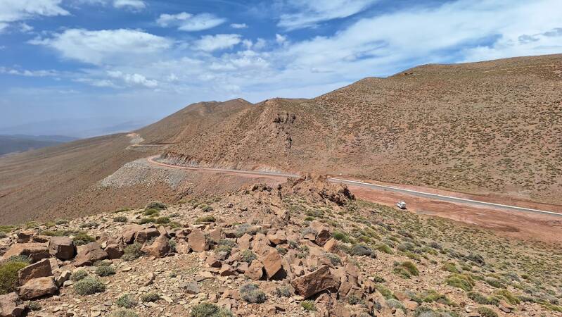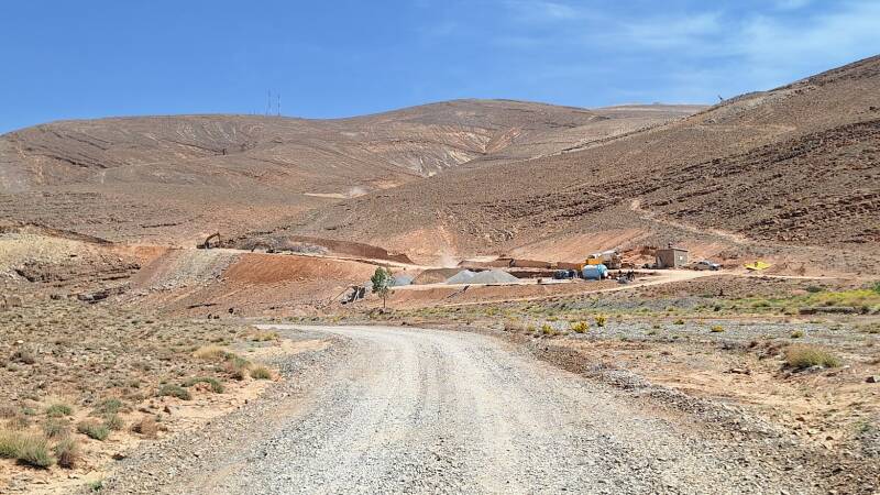Le haut des gorges du DADES, à la sortie de AIT MOUSSA, des travaux titanesques pour goudronner le Tizi OUANO (2.900 m) qui est souvent un gros soucis pour les locaux et le transport avec la neige qui peut bloquer l'approvisionnement jusqu'à 1 semaine avant de voir le déneigement effectif; Normalement, d'ici 2025, la route devrait être entièrement goudronnée, ainsi, une page va se tourner car c'était à n'en pas douter l'un des plus beaux cols (et une des plus belles piste !) du Maroc - En ce mois de mai 2024, seule la partie nord est goudronnée, il reste donc du boulot !