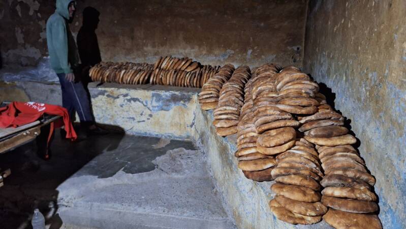 Nous arrivons à IMILCHILL, petite bourgade sympa et peu peuplée à 2.235 m d'altitude et où le climat n'épargne personne - encore une fois, nous avons beaucoup de chance car en principe les rues sont pleines - nous avons la chance de nous faire accompagner vers la vraie boulangerie locale ou le pain se fait à la minute, autant our les locaux que pour les écoles , et çà débite !